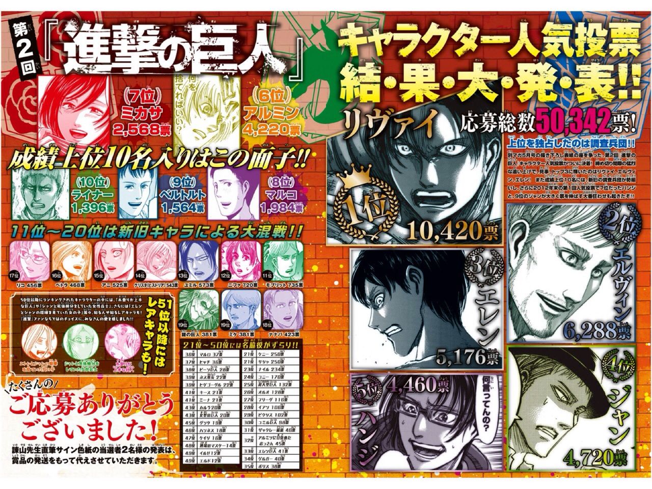 「進撃の巨人」第二回人気投票結果、1位はもちろんwwwwwwwww【画像】