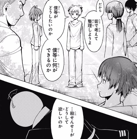 でもここでE組が「殺センセーは地球にとって害悪なんだからここは政府に任せよう!」とかいう結論出したらこの話詰むんですけど?