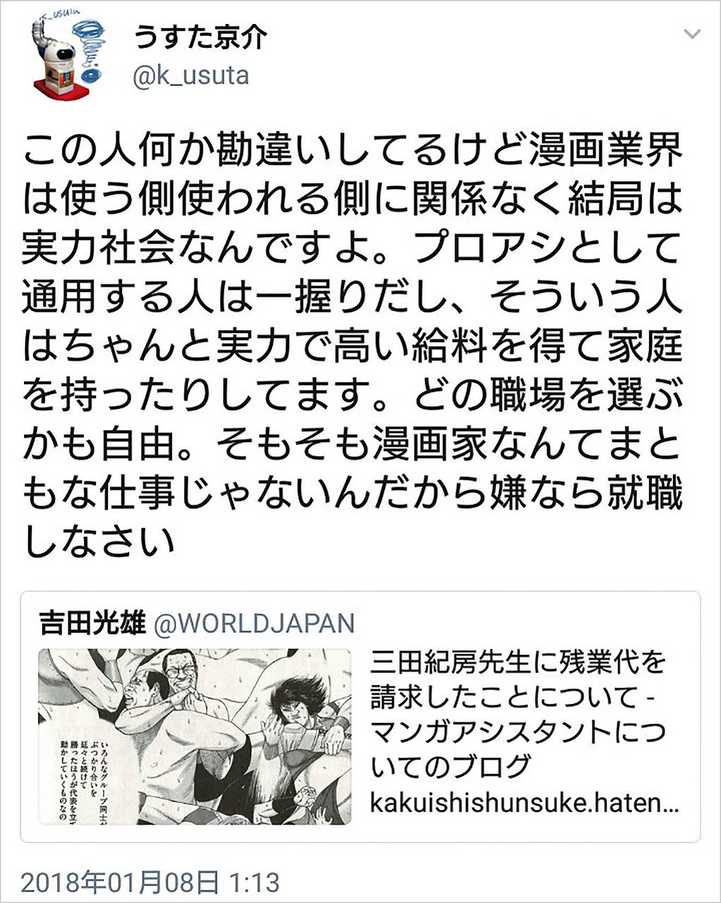 「こうした考えのマンガ家は非常に多いだろうとは思ってましたが、ここまではっきり言う方がいるとは思いませんでした。うすた先輩、勘違いしてるのはマンガ家たちの方だと私は思います。日本のマンガ家たちがアシスタントにしてきたことは搾取と呼ぶ他ないのではないですか?」