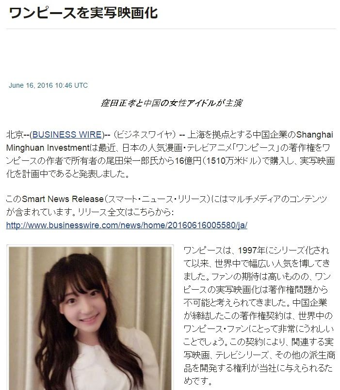 上海を拠点とする中国企業のShanghai Minghuan Investmentは最近、日本の人気漫画・テレビアニメ「ワンピース」の著作権をワンピースの作者で所有者の尾田栄一郎氏から16億円(1510万米ドル)で購入し、実写映画化を計画中であると発表しました。